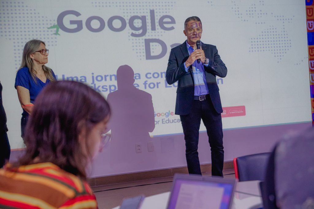 A capacitação explorou a plataforma de soluções inovadoras Google Workspace for Education, com uma programação que incluiu exposições, oficinas práticas e atividades interativas, abordando o uso pedagógico das ferramentas e a integração de recursos de inteligência artificial para potencializar as tecnologias da informação e comunicação (TICs) no ambiente educacional.