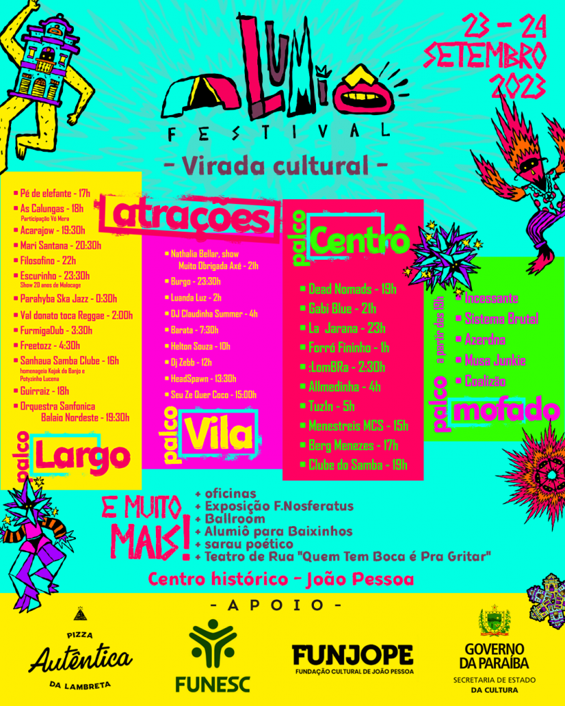 A Prefeitura de João Pessoa, por meio da sua Fundação Cultural (Funjope), está apoiando a 2ª edição do ‘Festival Alumiô – Virada Cultural’, evento que acontece neste sábado (23), a partir das 17h, e segue até o domingo (24). A programação acontece no Centro Histórico de João Pessoa e a expectativa da organização é atrair mais de 10 mil pessoas.