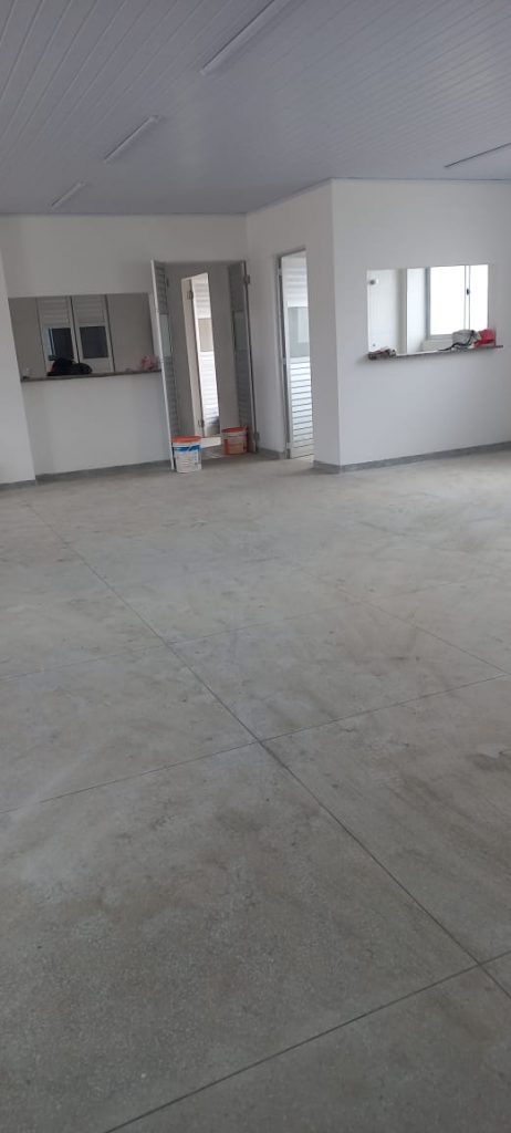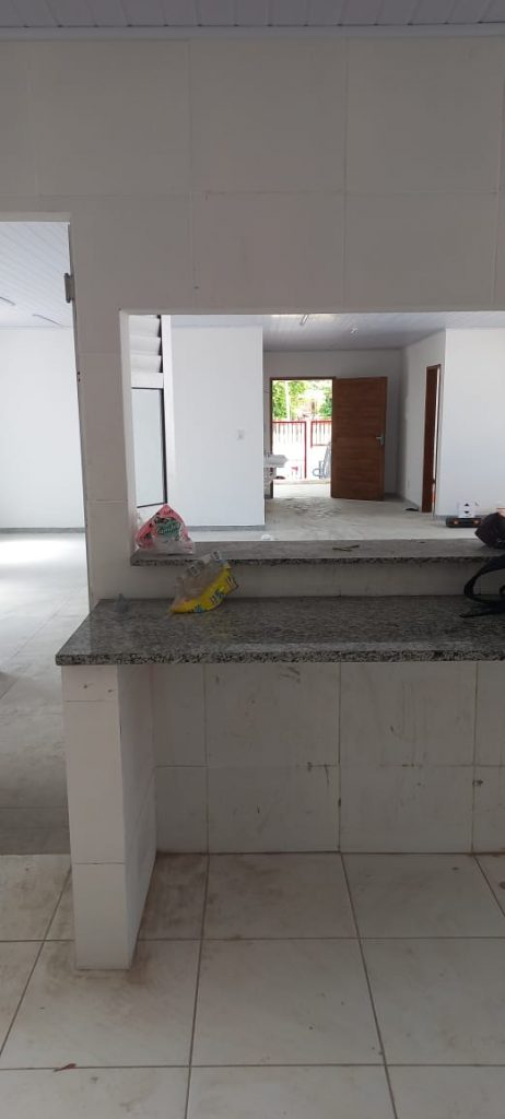No momento estão sendo executados serviços de pintura, acabamento de fachada, instalação de portões e grades, instalações hidrossanitárias, ajustes de portas de madeira, rejunte de revestimentos internos e texturização de muro.