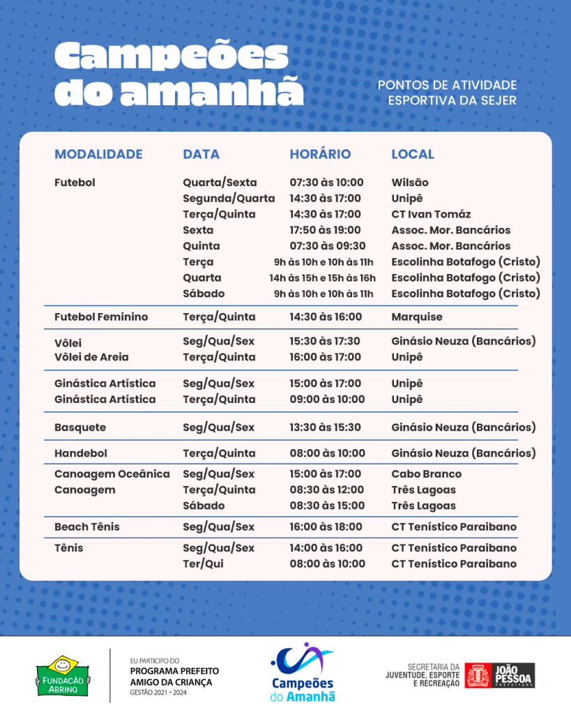A Prefeitura de João Pessoa, através da Secretaria de Juventude, Esporte e Recreação (Sejer), iniciou, nesta terça-feira (20), as renovações e inscrições para novos alunos no projeto Campeões do Amanhã. Além de gratuitas, os registros terão a duração de três dias e contemplará toda a comunidade entre 8 e 15 anos de idade. Os selecionados terão acesso a treinamentos especializados, mentoria e oportunidade para participar de competições.