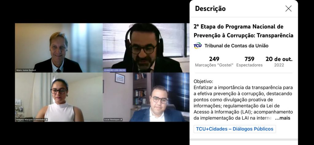 Com o objetivo de enfatizar a importância da transparência para a efetiva prevenção à corrupção e a Lei de Acesso à Informação (LAI), o secretário executivo de Transparência do Município de João Pessoa, Lucas Henriques de Queiroz Melo, foi um dos palestrantes da 2ª Etapa do Programa Nacional de Prevenção à Corrupção: Transparência. O evento foi promovido, de forma online, pelo Tribunal de Contas da União (TCU), nesta quinta-feira (20), e contou com a participação de mais de 700 pessoas assistindo a transmissão.