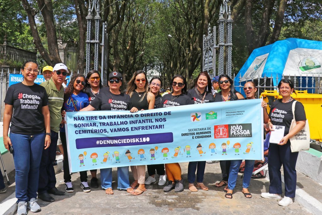 Ação contra o trabalho infantil – Psicólogas, assistentes sociais e técnicos da Sedhuc dialogaram com a população, numa ação de sensibilização para a erradicação do trabalho infantil, no Cemitério de Cruz das Armas e demais cemitérios públicos da Capital. A técnica de referência de Ações Estratégicas de Erradicação do Trabalho Infantil (Aepeti), explicou que 20 técnicos estão atuando neste sábado. “Nós identificamos a necessidade de combater o trabalho infantil em diversos espaços, inclusive nos cemitérios públicos e estamos dialogando com a população, no sentido de informar que crianças e adolescentes menores de 16 anos não podem trabalhar – exceto quando estão na condição de aprendiz, de acordo com o que diz a legislação”, esclareceu.