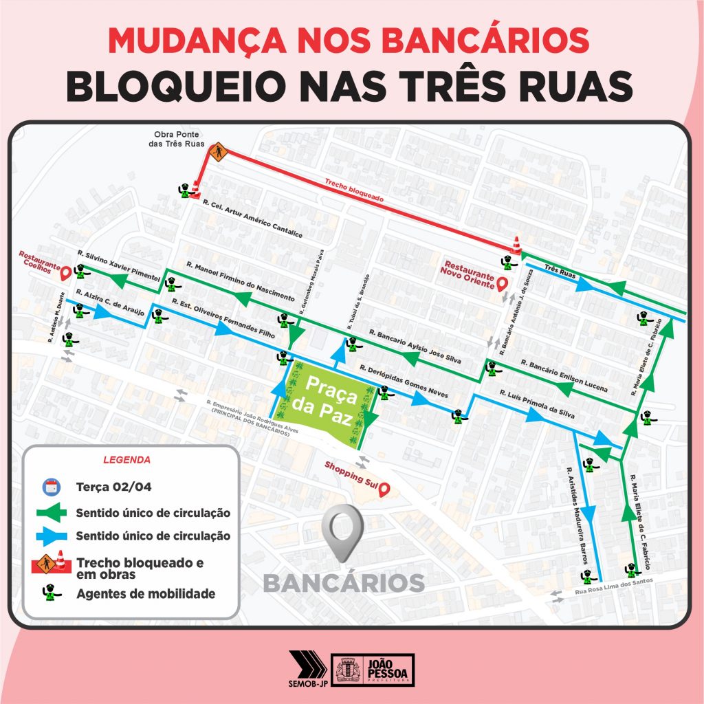 Como fica – Os veículos que vêm sentido bairro/Centro, a partir da Rua Rosa Lima dos Santos, deverão evitar as Três Ruas e seguir pelas ruas Maria Eliete de C. Fabrício, Bancário Enilson Lucena, Bancário Aylsio José Silva, Manoel Firmino do Nascimento e Silvino Xavier Pimentel, chegando à Rua Antônio Miguel Duarte para acesso à principal dos Bancários.