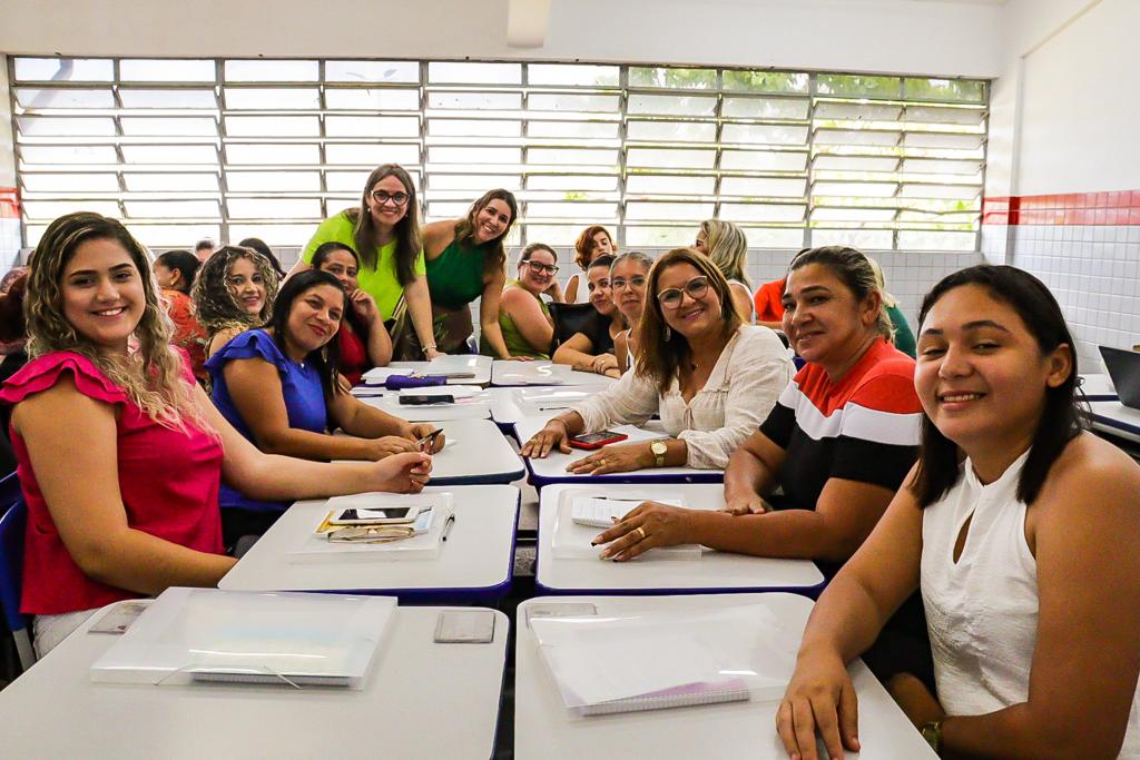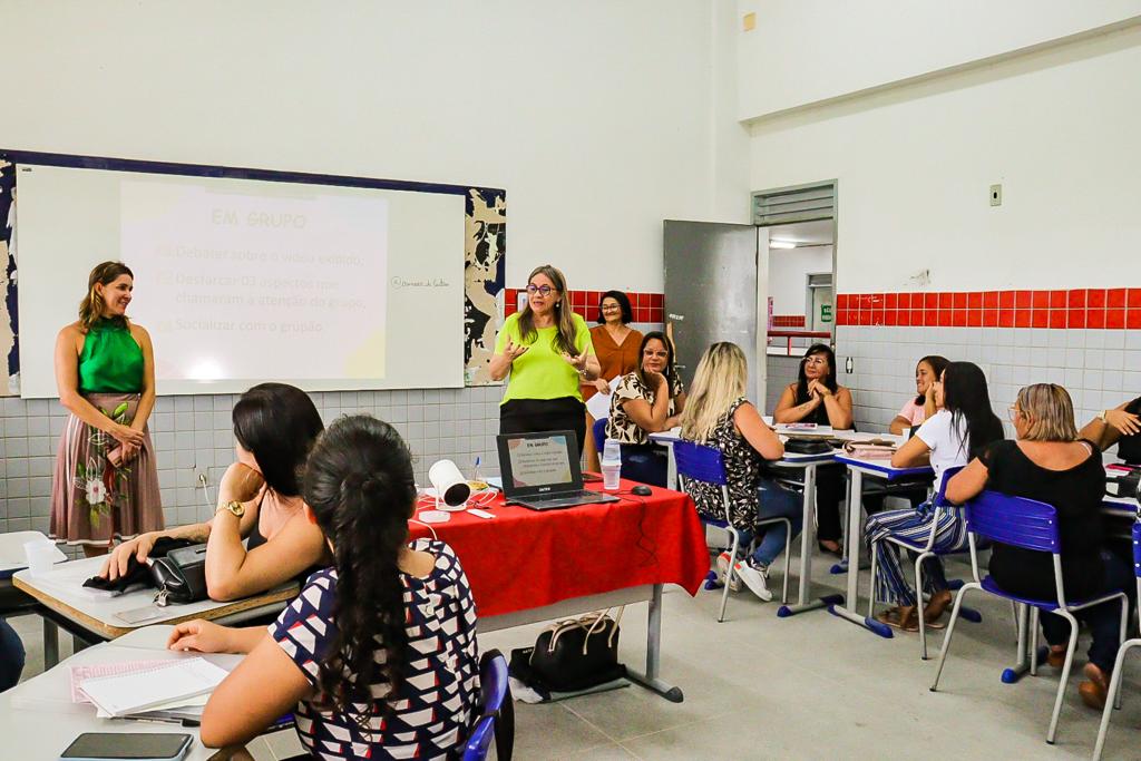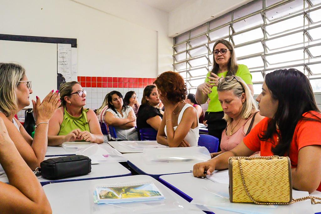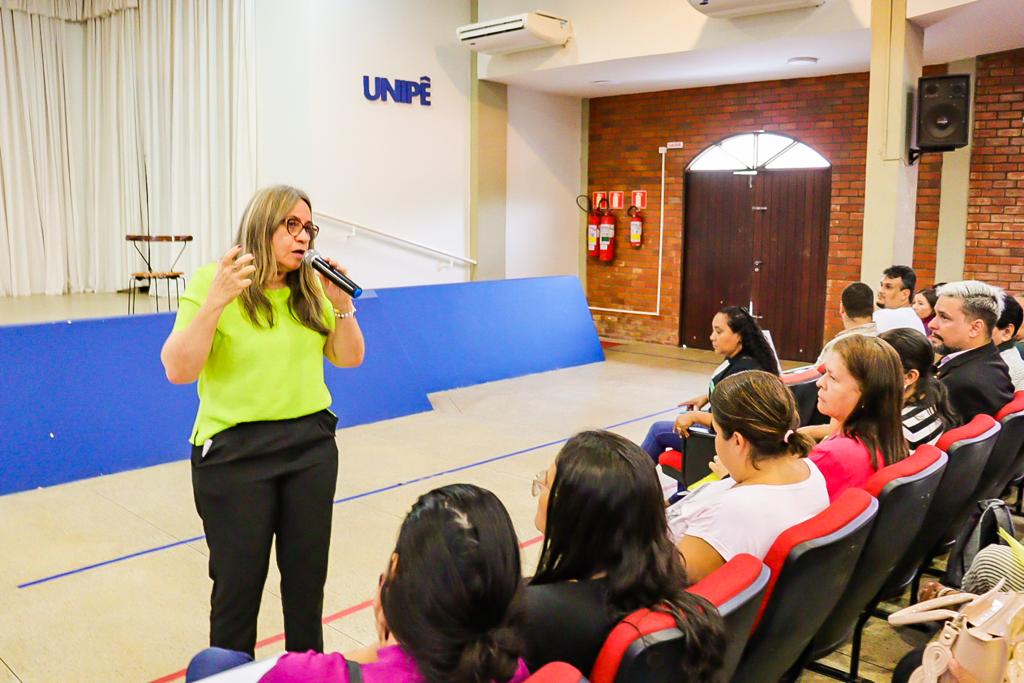 Auxiliares de sala dos CMEIs e cuidadores dos estudantes da Educação Especial participam de minicursos durante o turno da manhã desta segunda-feira (6), na Escola Municipal Leonel Brizola e no auditório do Centro Universitário Unipê.