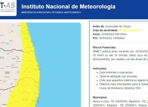A Prefeitura de João Pessoa, por meio da Coordenadoria Municipal de Proteção e Defesa Civil (Compdec/JP), mantém suas equipes de prontidão após o alerta de perigo potencial de chuva para a cidade emitido, neste domingo (3), pelo Instituto Nacional de Meteorologia (Inmet). De acordo com o alerta, que é válido até as 23h59 deste domingo, há possibilidade de chuvas entre 20 e 50 milímetros (mm).