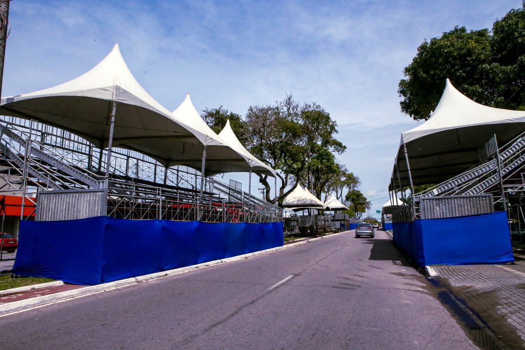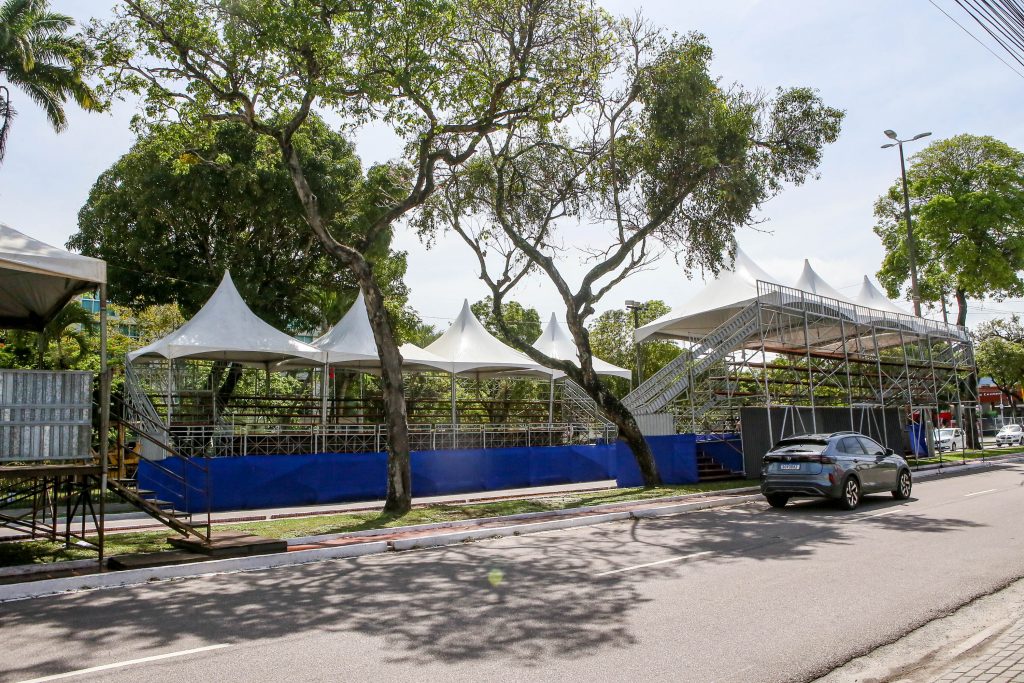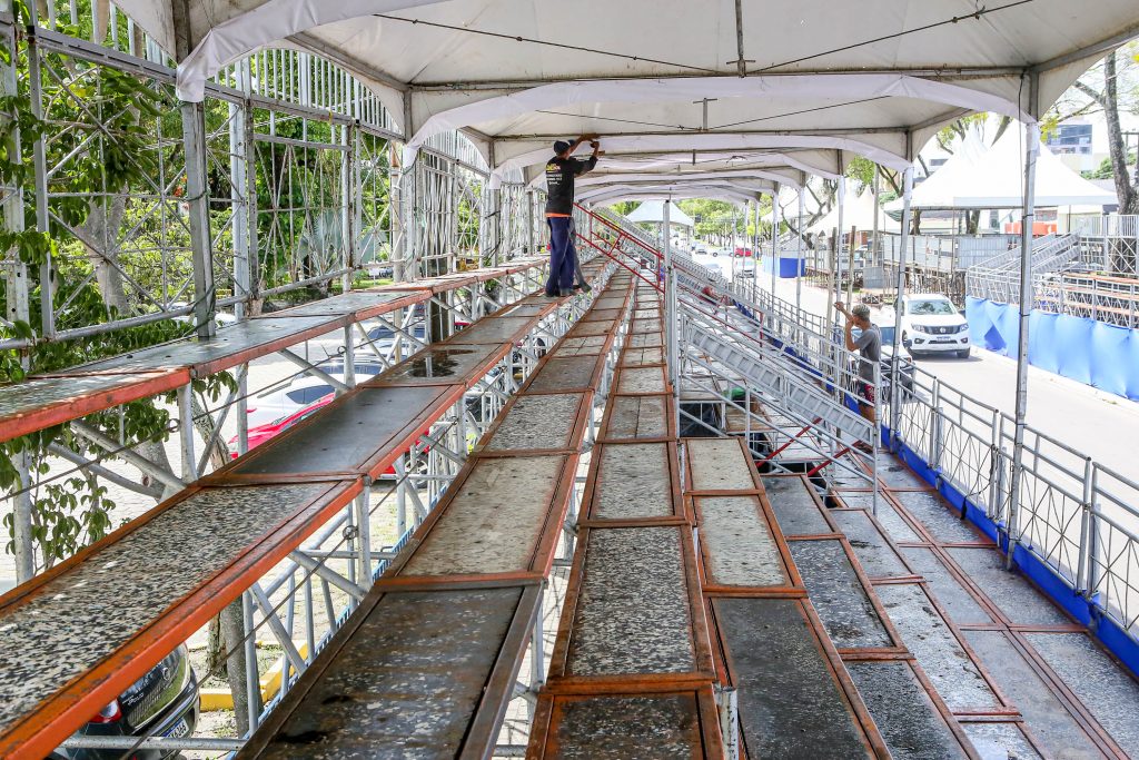 Também integram a montagem os tablados destinados à comissão julgadora, autoridades e imprensa, além da instalação de 20 banheiros químicos distribuídos ao longo do percurso. A estrutura foi projetada para acomodar melhor o público que acompanha os quatro dias de apresentações na avenida.