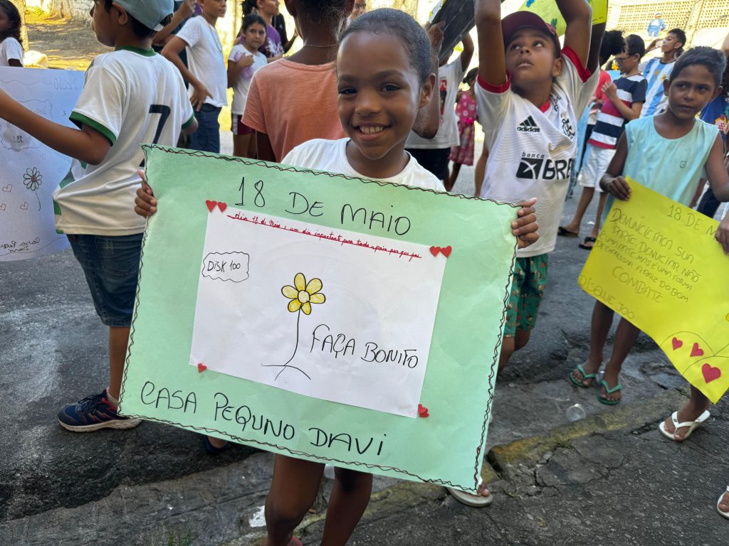 “Nosso objetivo é trazer para a população informações sobre o 18 de Maio, a importância do cuidado com as nossas crianças e adolescentes. Sabemos que o abuso existe nas comunidades, dentro de casa, então que as famílias possam estar observando seus filhos e filhas. Como instituição, estamos fazendo esse fortalecimento da rede e das mais de 200 crianças que se envolvem com os nossos projetos. Todas passaram por uma formação sobre o tema”, afirmou.