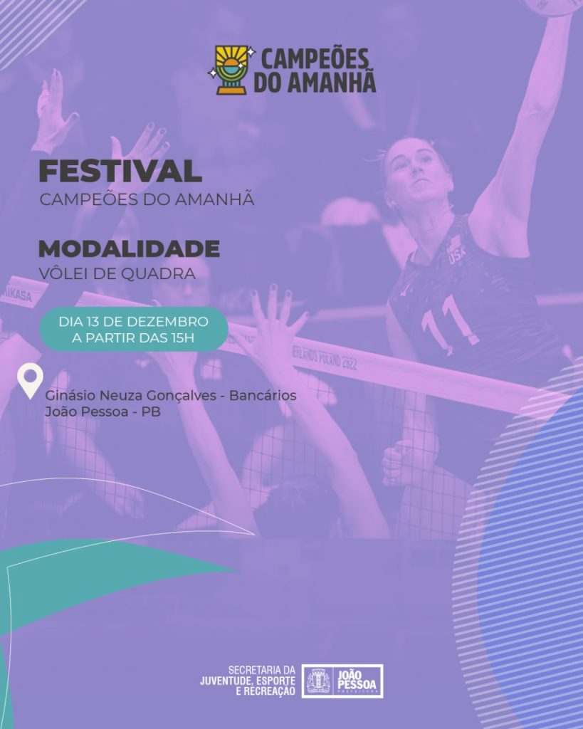 A Prefeitura de João Pessoa, através da Secretaria de Juventude, Esporte e Recreação (Sejer), promove nesta sexta-feira (13), mais um Festival de Vôlei de Quadra do ‘Campeões do Amanhã’. O evento será realizado no Ginásio Neuza Gonçalves Brandão, nos Bancários, a partir das 15h e deve contar com aproximadamente 80 participantes da modalidade.