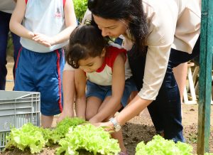 Etapas – O alimento que é colhido na horta, vai para a cozinha onde passa por todo o processo de higienização e em seguida é servido no almoço das crianças. A atividade começa na sala de aula onde é explicada a importância e o valor dos legumes. Em seguida, as crianças fazem visitação no terreno, participam da irrigação e da colheita.
