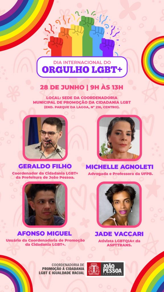 A programação do evento conta com a apresentação cultural da Top Drag Paraíba Thallyta Marchiori, além de uma roda de diálogo, com o tema ‘28 de junho LGBTQIA+: Orgulho de ser quem somos’, para refletir sobre as questões que envolvem o advocacy, o serviço público e a importância dos movimentos sociais para o fortalecimento da comunidade.