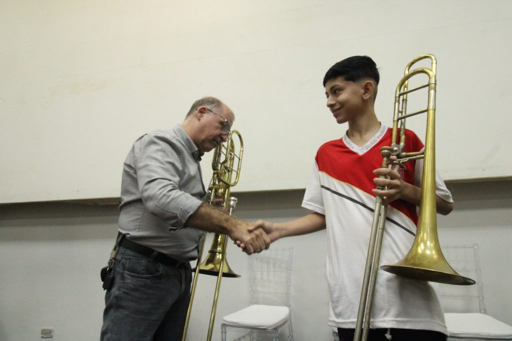 Carlos Eduardo é aluno da Escola Municipal Ativa Integral Anísio Teixeira e toca trombone há 3 anos. Ele relatou a experiência desse momento. “Gostei bastante da apresentação dele como também dos bons ensinamentos. O professor me ajudou muito na articulação, nos movimentos de cada posição, de cada nota, na postura, posicionamento do instrumento. Agora é estudar e se dedicar cada vez mais”, relatou.