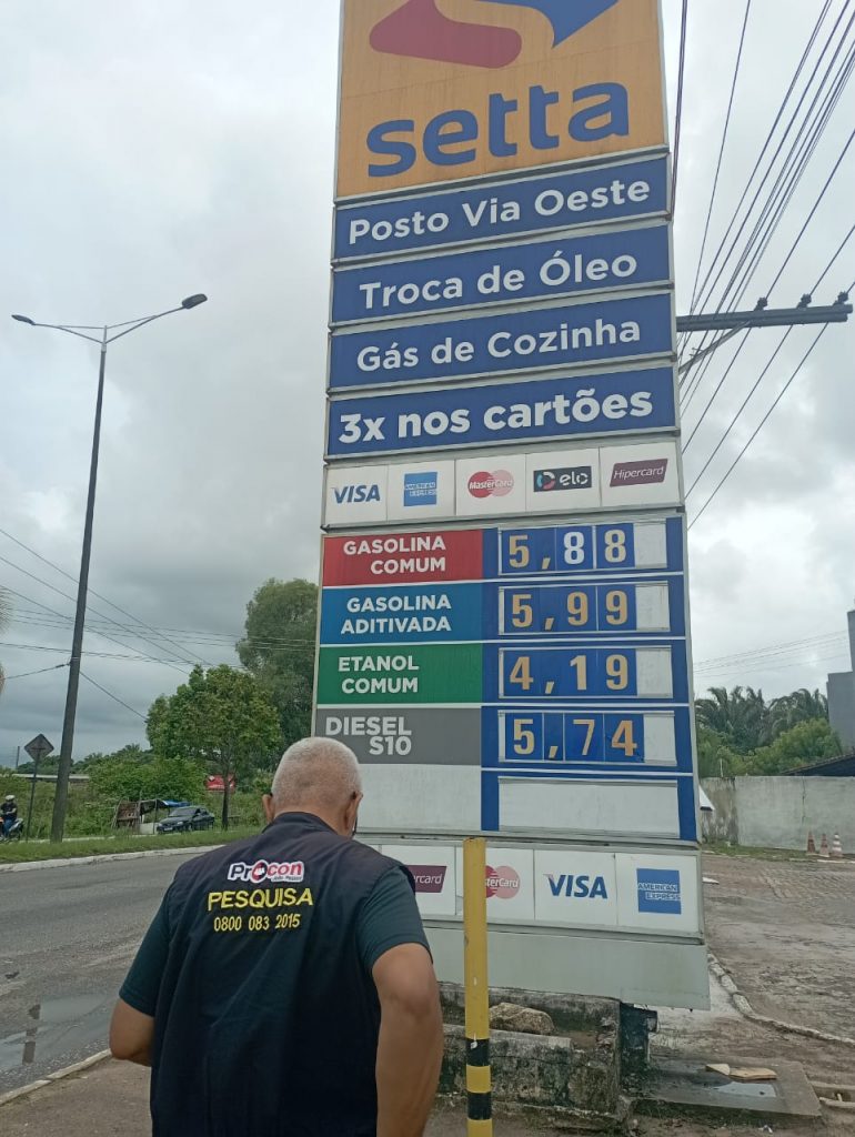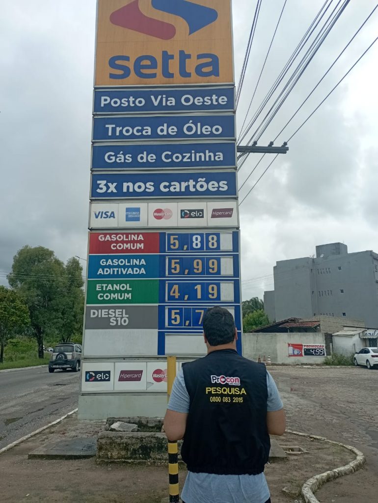 Pesquisa de preços de combustíveis da Secretaria Municipal de Proteção e Defesa do Consumidor de João Pessoa aponta variação de 5,4% no preço do litro da gasolina comum para pagamento à vista, oscilando entre R$ 5,590 (Posto Elesbão – Água Fria) e R$ 5,890 (Posto Santa Rita – Mangabeira, Cowboy – Valentina e Cruzeiro do Sul – Muçumagro), diferença de R$ 0,30. Para pagamento no cartão de crédito, esses valores variam entre R$ 5,590 e R$ 6,020.