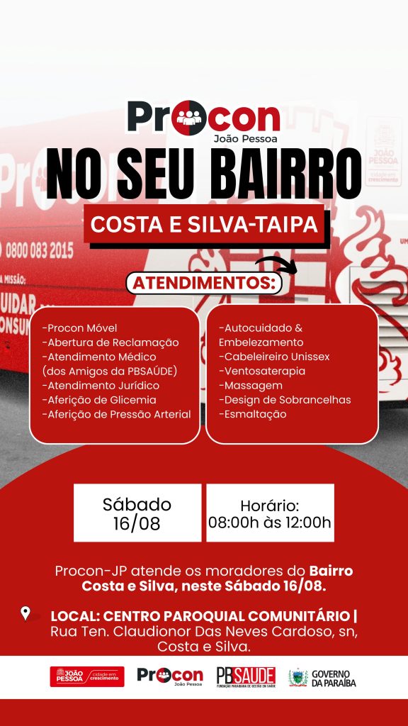 Saúde – No quesito assistência à saúde, haverá atendimento médico proporcionado pela Fundação Paraibana de Gestão em Saúde (PBSaúde), a exemplo de aferição de glicemia e de pressão arterial. “A ações do ‘Procon-JP no seu bairro’ vem contando com a importante parceria da PBSaúde, que atende as pessoas em seu próprio local de moradia”, pontua Junior Pires.