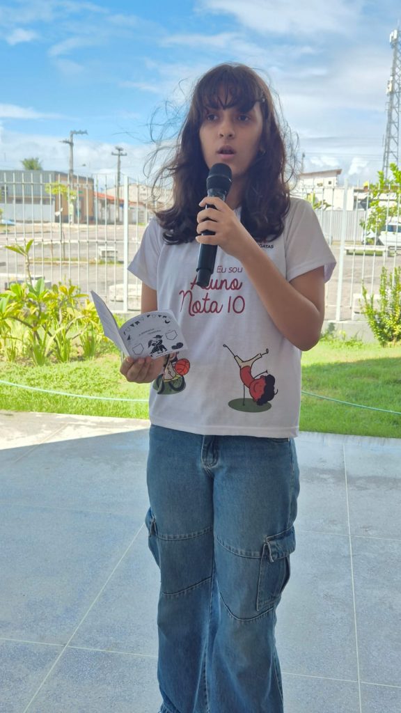 Milena Freitas Andrade é aluna do 9° ano da Escola Municipal Afonso Pereira da Silva. Ela apresentou o cordel feito por ela, intitulado ‘A Donzela Teodora’, fazendo uma intertextualidade do cordel de Leandro Gomes de Barros.