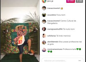 Aulas on-line – Ao todo são 41 professores, que se revezam durante toda semana com várias aulas diferentes, como dança, alongamento, aeróbica, ritmos e localizada. Para ter acesso a programação completa da semana basta acessar o perfil, no Instagram, do projeto (@jpvs_jp). Com duas transmissões ao vivo por dia, às 7h30 e às 17h, as aulas chegam a ter mais de 300 visualizações e ajudam as pessoas que estão em casa, cumprindo a quarentena, a fazerem atividade física de maneira segura, mantendo a saúde e o bem-estar.
