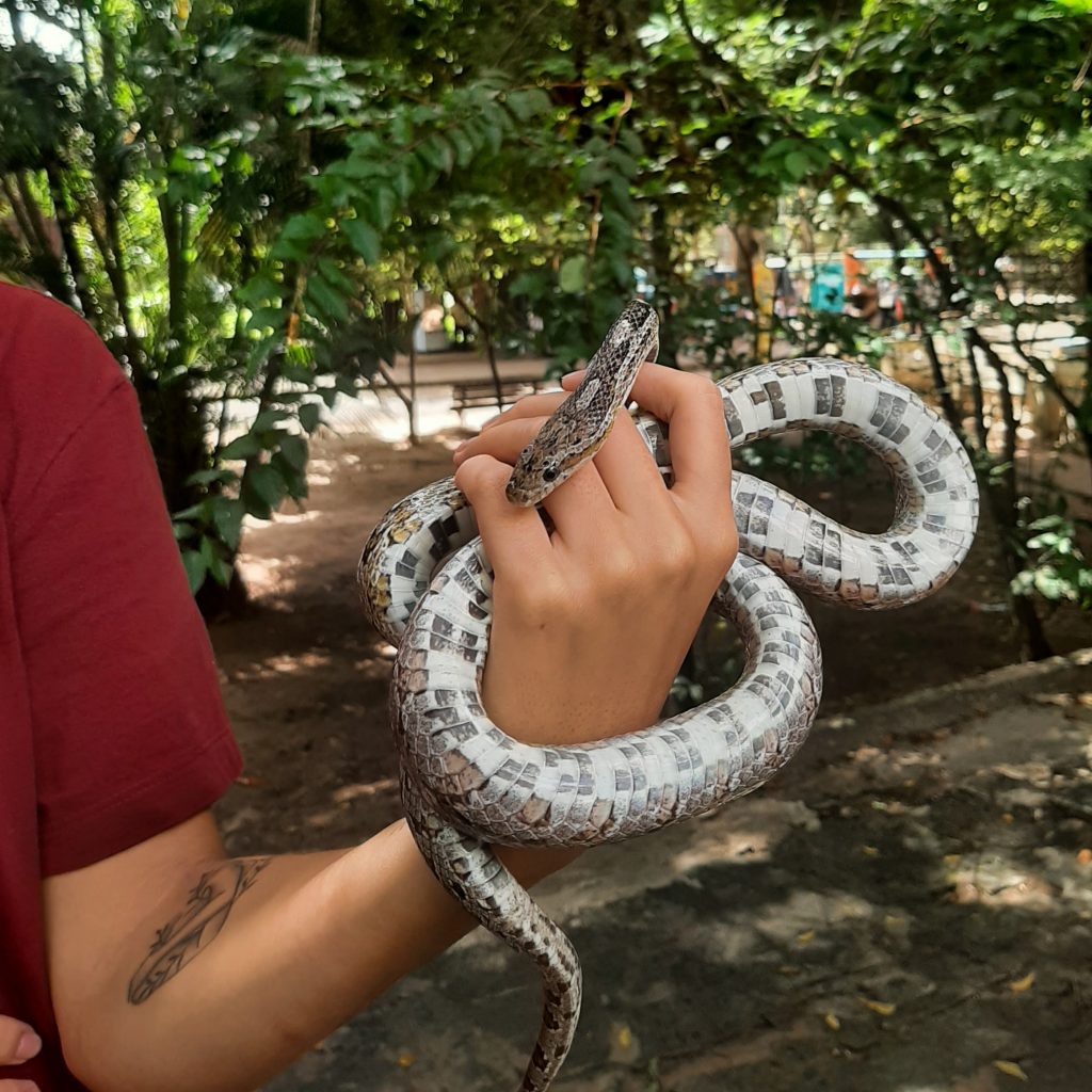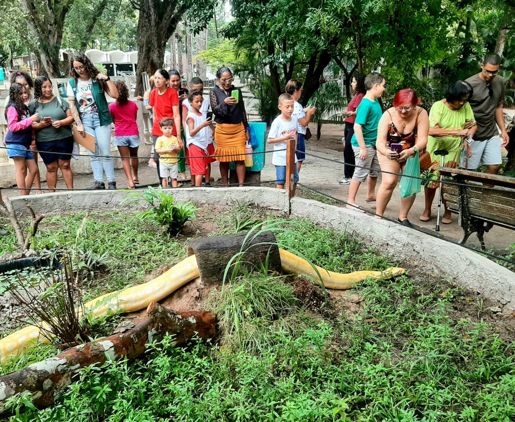 Durante a Trilha da Biodiversidade, os participantes puderam observar diversas espécies de plantas e aprender sobre a importância da preservação do meio ambiente. Logo após, eles acompanharam o momento do ‘Banho de Sol dos Répteis’, onde viram de perto a píton albina, que pesa cerca de 70 quilos e mede em torno de 4,3m, além de 4 serpentes da espécie corn snake. A atividade permite aos visitantes entenderem mais sobre o comportamento desses animais e a importância da luz solar para eles, além de um pouco da rotina do zoológico.