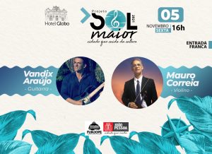 O fim de semana está chegando e o Hotel Globo está de portas abertas para receber o público que gosta de ver um belo pôr do sol ao som de boa música. A edição do projeto ‘Sol Maior’ desta sexta-feira (5) traz a programação prevista para a semana passada, que foi cancelada em razão do mau tempo. Assim, o guitarrista Vandix Araújo e o violinista Mauro Correia chegam afinadíssimos para o dueto instrumental. A apresentação começa às 16h.