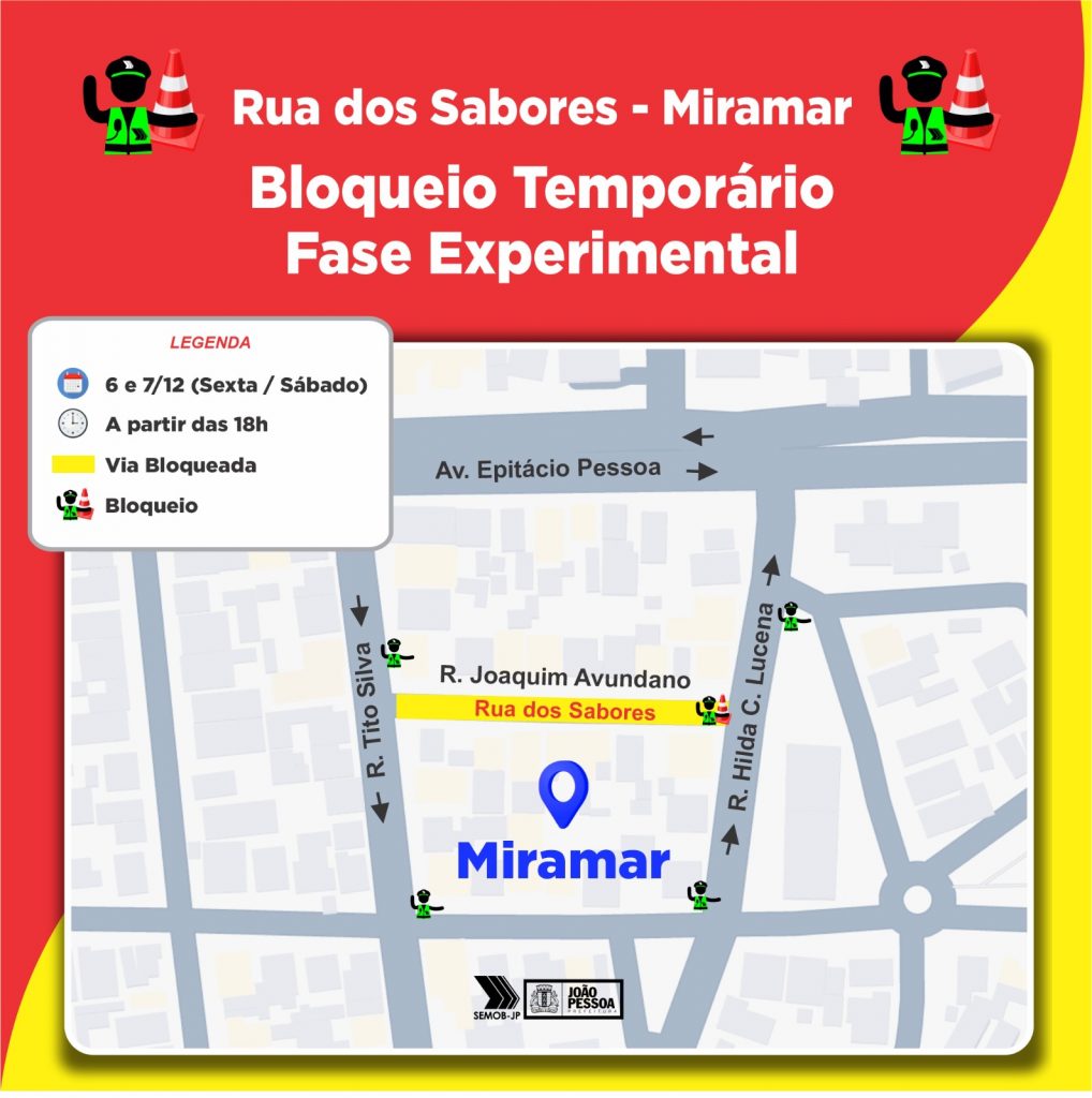 A Prefeitura de João Pessoa, através da Superintendência Executiva de Mobilidade Urbana (Semob-JP) e da Secretaria de Desenvolvimento Urbano (Sedurb-JP) vai dar início a partir das 18h, nesta sexta-feira (6) e sábado (7), em caráter experimental, a interdição da Rua Joaquim Avundano, conhecida como ‘Rua dos Sabores’, no bairro do Miramar. Desde que foi inaugurada em outubro deste ano, a localidade se tornou polo gastronômico da cidade e, com isso, está obtendo grande fluxo de pessoas e veículos.