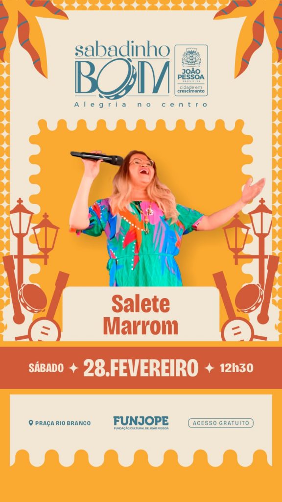 O clima boêmio e acolhedor do Centro Histórico da capital paraibana volta a embalar mais uma edição do Sabadinho Bom, realizado pela Prefeitura de João Pessoa, através de sua Fundação Cultural (Funjope), neste sábado (28), a partir das 12h30, na Praça Rio Branco. A atração da semana é a cantora Salete Marrom, que promete um repertório vibrante marcado pela riqueza do frevo, do chorinho e do samba.