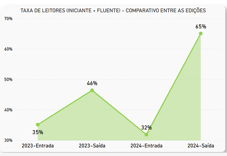 Apesar de não atingir as metas estabelecidas para cada ano de ensino, a Rede já está mais próxima deste feito. A última avaliação de leitura realizada em dezembro de 2024 pela Rede Municipal, mostra a evolução concreta dos níveis de leitura dos estudantes ao longo do ano letivo.