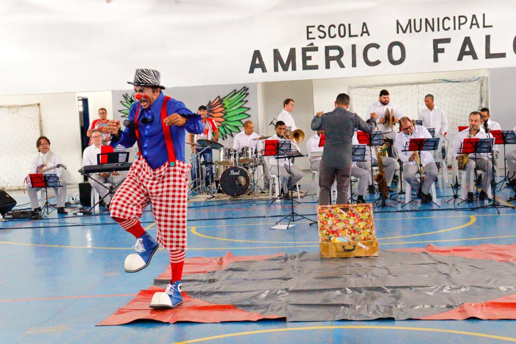 A música e arte circense fizeram a alegria dos alunos da Escola Municipal Américo Falcão, no bairro do Cristo Redentor, nesta terça-feira (11). A ação realizada pela Secretaria de Educação e Cultura (Sedec-JP), por meio da Seção de Bandas, contou com a Orquestra da Sedec e o Palhaço Coceirinha que apresentaram o espetáculo ‘O palhaço que não gostava de música’.