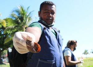 Secretaria de Saúde realiza ação de catação de caramujo africano na praia