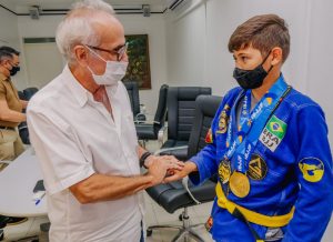 O prefeito Cícero Lucena recebeu, na tarde desta segunda-feira (09) em seu gabinete no Centro Administrativo Municipal (CAM), o atleta Arthur Piloto Oliveira de Sousa, pessoense que ganhou o ouro no Pan Kids IBJJF Jiu Jitsu Championship 2021, nos Estados Unidos. O encontro foi oportunidade para parabenizar o atleta de 11 anos, que viajou com apoio da Prefeitura de João Pessoa.