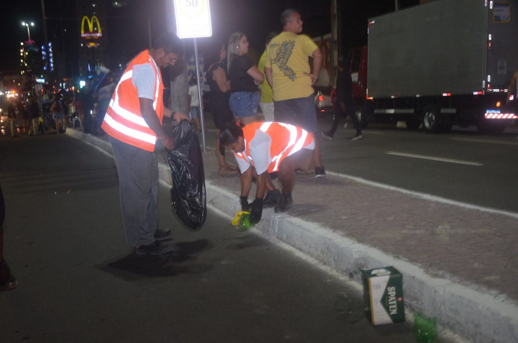De acordo com a engenheira da Emlur, Raissa Fernandes, eles foram divididos em dois grandes grupos. “Uma turma realizou os serviços de varrição e coleta no percurso do posto Free Way até o Pão de Açúcar e a outra seguiu de lá até a orla”, explicou. O trabalho continuou pela madrugada e, pela manhã, outra equipe de aproximadamente 25 pessoas fez o repasse na avenida. O trabalho também contemplou a faixa de areia das praias. Foram coletadas 5,6 toneladas de materiais, no total”, afirmou.