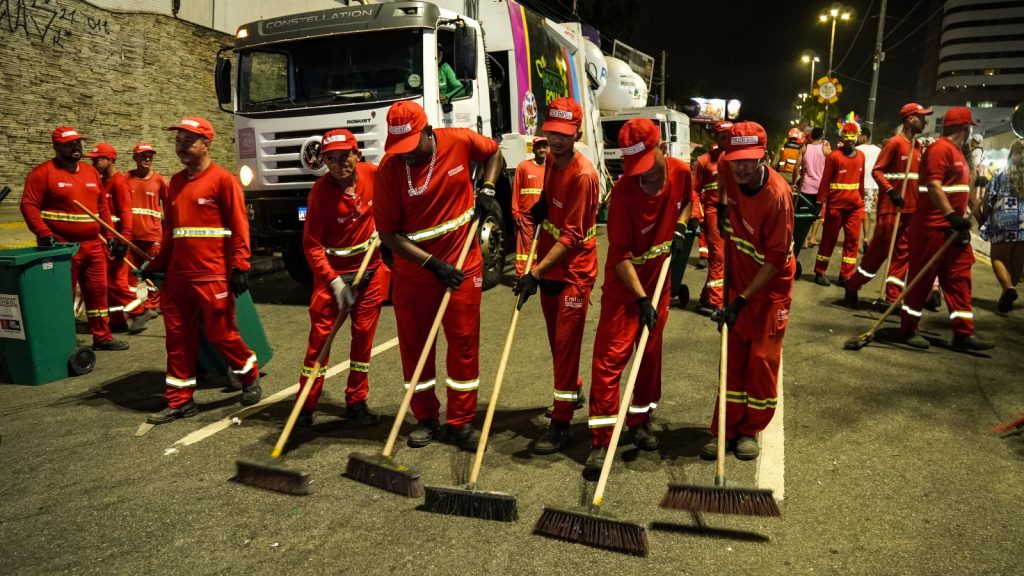 Agentes de limpeza – Antes do nascer do sol, nesta segunda-feira (24), a Via Folia já estava limpa, após o trabalho dos agentes da Emlur. No fim da noite anterior, mais de 250 agentes de limpeza iniciaram os serviços de varrição e coleta de resíduos após a passagem do bloco Virgens de Tambaú.