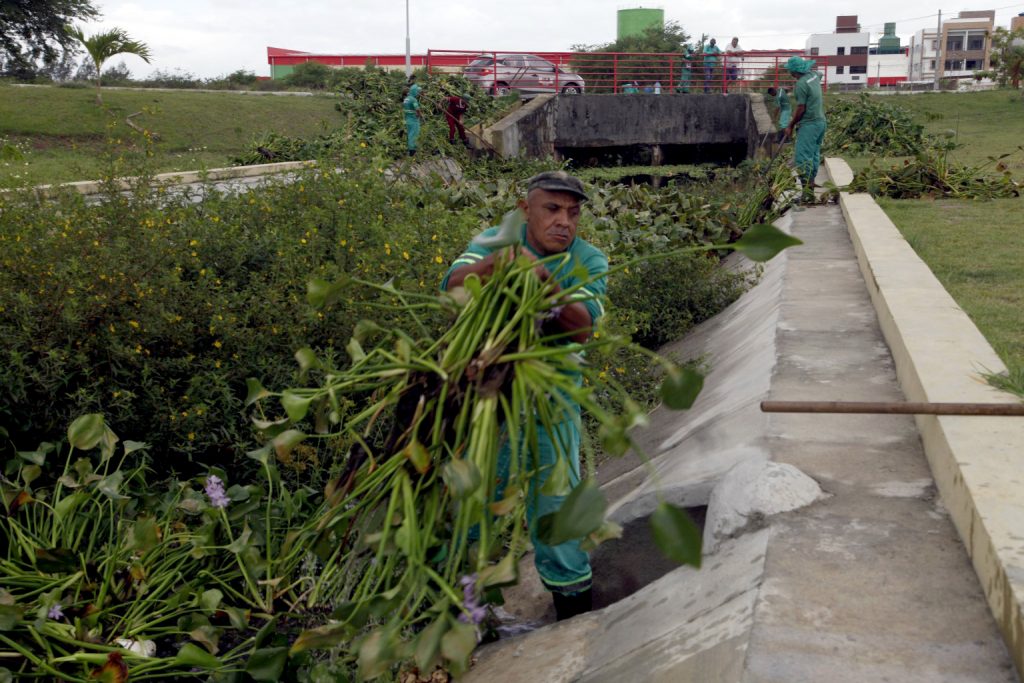 A equipe aquática da Emlur retira vegetação que cresce nos canais e recolhe os resíduos. Nesta semana, os agentes estão na comunidade Santa Clara, no Castelo Branco. O monitor da equipe aquática, Joseilton da Silva, explica que os resíduos encontrados variam conforme as regiões da cidade.