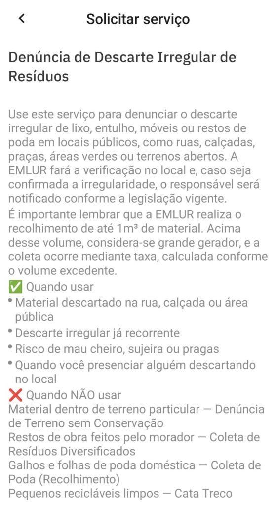 Pelo aplicativo, o cidadão pode informar pontos de descarte irregular de lixo, entulho, móveis inservíveis e restos de poda deixados em vias públicas, calçadas, praças, áreas verdes ou terrenos abertos. A denúncia pode ser feita de forma rápida, com o envio de foto, localização e informações para contato.