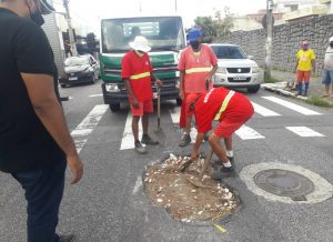 Com a trégua da chuva, equipes da Secretaria de Infraestrutura de João Pessoa (Seinfra) estão, neste sábado (15), executando serviços de recuperação da pavimentação que cedeu, em alguns bairros, por conta da forte precipitação registrada na Capital nos últimos dois dias.