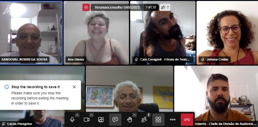 Da gestão pública, participaram da reunião Marcus Alves, Sandoval Nóbrega e Paulo Roberto, chefe da Divisão de Audiovisual; Ana Isaura Diniz e Juliana Crelier, do Fórum do Audiovisual; Caio Ceragioli, do Fórum de Teatro; Dina Faria, do Fórum de Produtores; e Lucas Peregrino, do Fórum do Patrimônio Cultural.