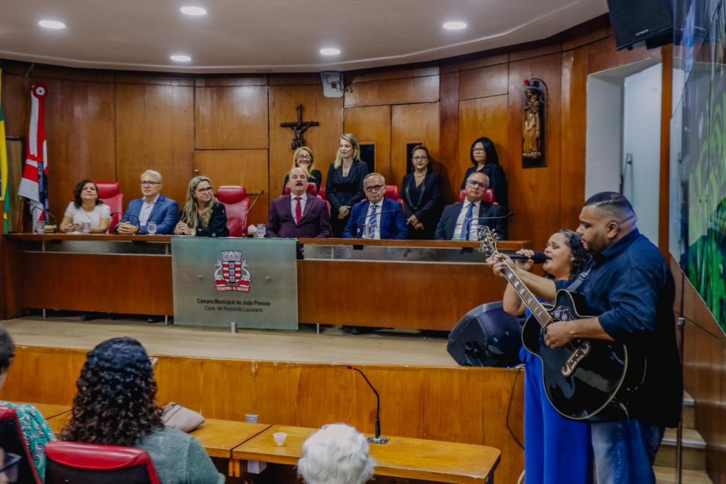 O prefeito Cícero Lucena participou, na tarde desta quarta-feira (21), da sessão solene para entrega do título de cidadã pessoense à missionária Eva Rego Oliveira Nóbrega, presidente do Instituto Bíblico Betel Brasileiro. O evento aconteceu no plenário da Câmara Municipal de João Pessoa.