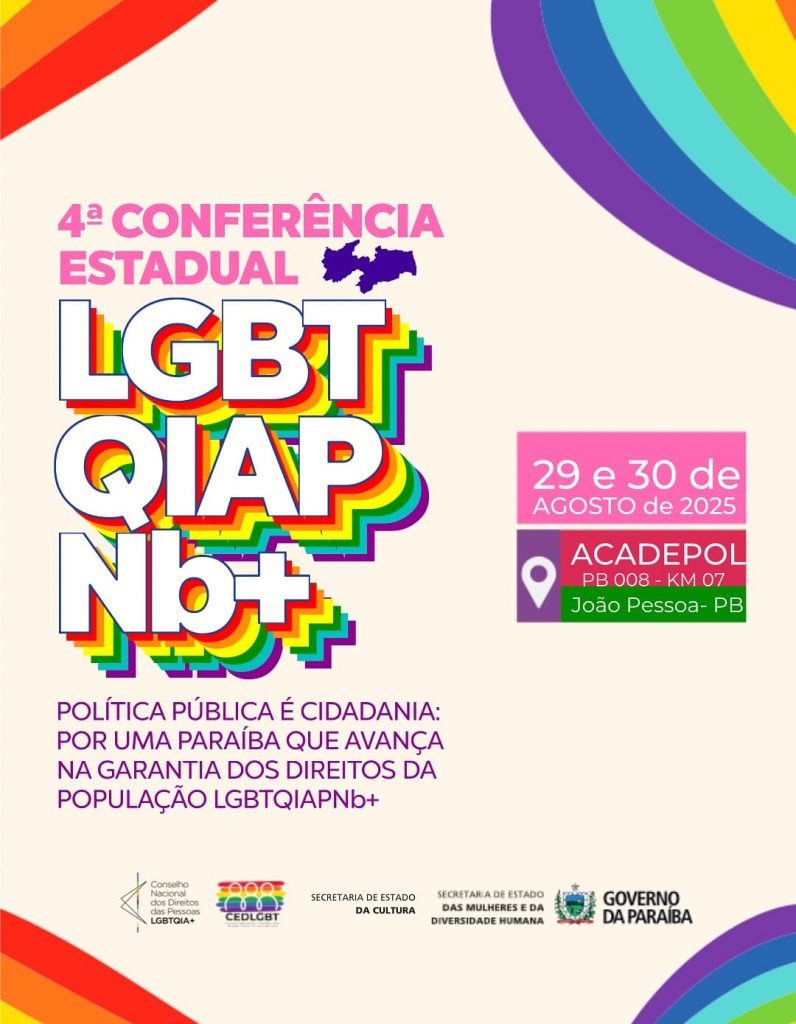 Com o tema “Política Pública é cidadania: por uma Paraíba que avança na garantia dos direitos da população LGBTQIAPNb+”, o evento, que começará às 15h, contará com várias palestras, debates e apresentações culturais. Esta etapa também vai eleger os delegados e delegadas que vão representar a sociedade civil e poder público na fase nacional, prevista para ocorrer no mês de outubro, em Brasília.