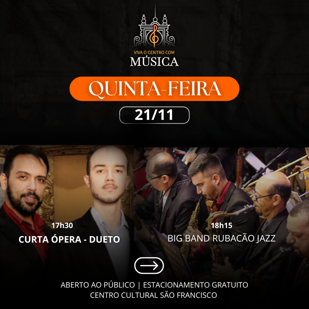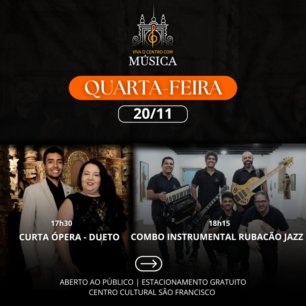 Nesta quarta-feira, a programação tem início às 17h30 com o Curta Ópera – Dueto, oferecendo ao público uma seleção de peças clássicas em um formato intimista e acessível. Logo em seguida, às 18h15, será a vez do combo instrumental da Big Band Rubacão Jazz, composto por Rodrigo Alves (sanfona), Diego Rafael (guitarra), Hermano de Paula (baixo), Fábio Lima e Daniel Araújo (bateria e percussão).