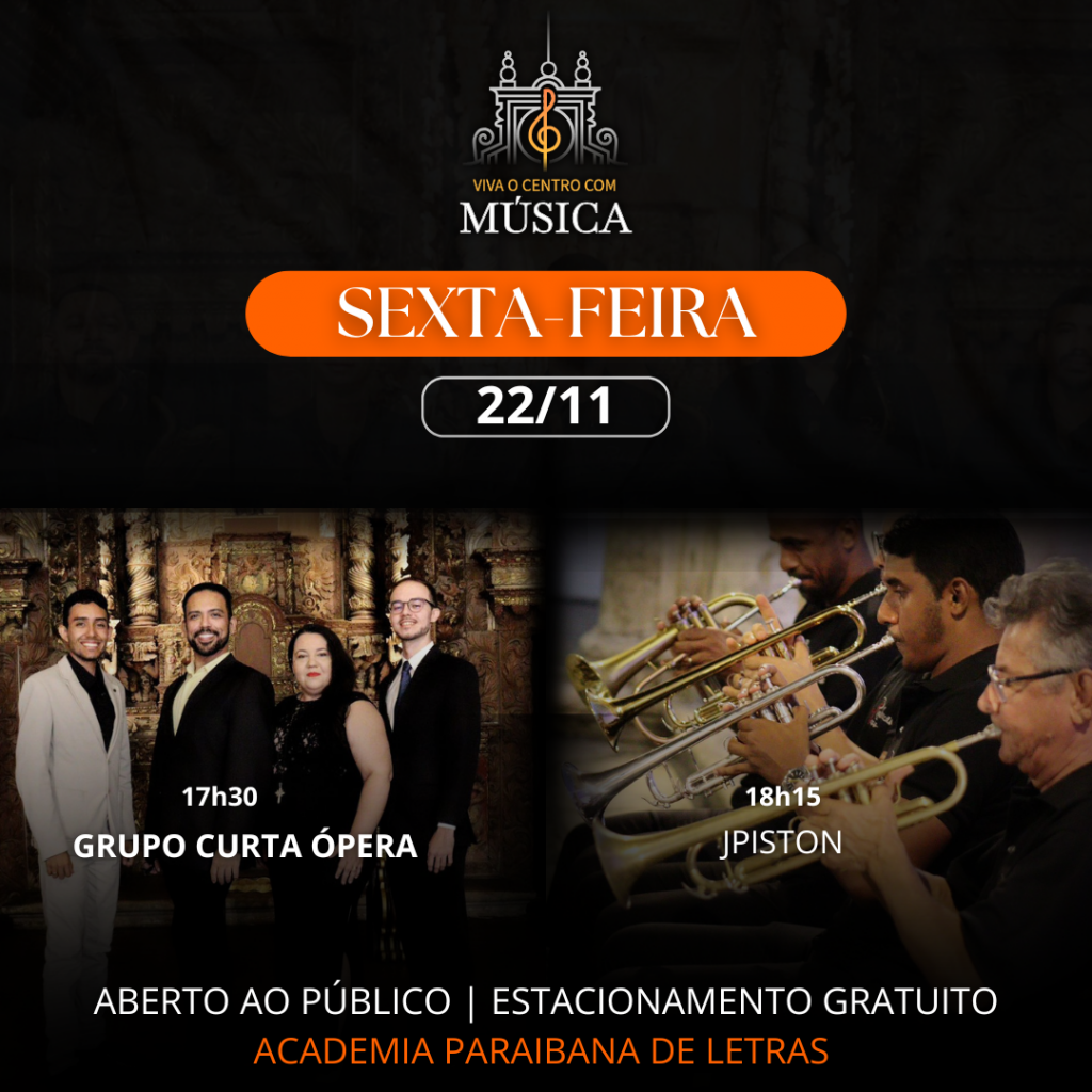 Mudança de local – Na sexta-feira (22), o projeto Viva o Centro com Música não realizará apresentações no CCSF devido à programação previamente agendada no local. De forma que o evento será transferido, excepcionalmente, para Academia Paraibana de Letras (APL), que fica na frente do CCSF, com as apresentações começando às 17h30 no novo jardim das letras.