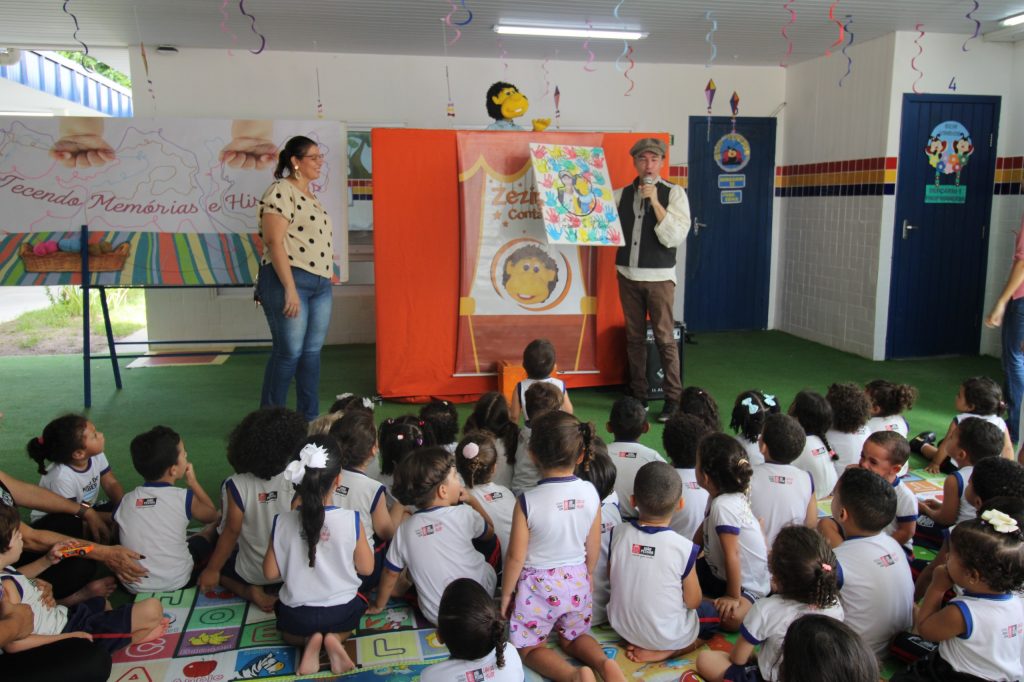 As crianças do Ninho do Saber Olga Maria Leite sorriram, interagiram e se divertiram em uma manhã muito especial na companhia de ‘Zezinho Contação’. O personagem infantil celebrou o Dia Nacional do Contador de História, comemorado nesta quinta-feira (20). A ação foi preparada pela equipe da Secretaria de Educação e Cultura de João Pessoa (Sedec-JP).