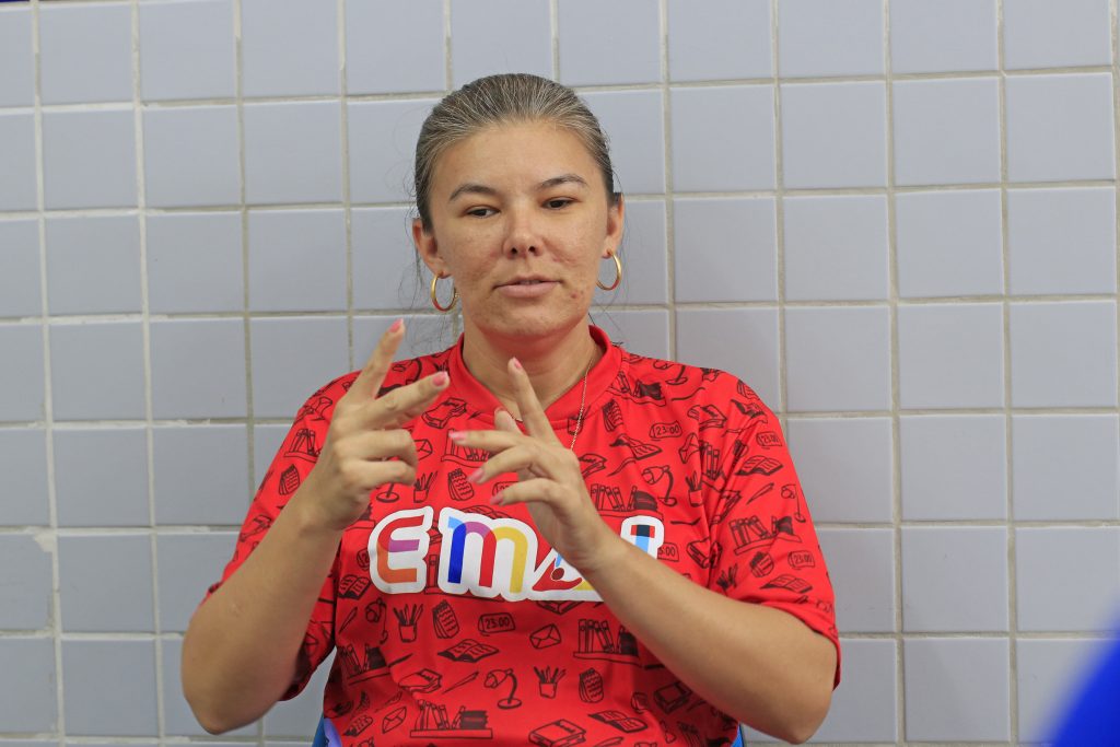Sandra Diniz também explicou como funciona a dinâmica na EMAI Celso Furtado. “A gente segue o currículo normal da escola. As aulas são incluídas na sala, mas a gente acrescenta os momentos em que os surdos estão agrupados em um momento só deles, para a socialização entre eles, valorização. Nesse momento que eles estão separados dos ouvintes, eles estudam a gramática da Libras e a gramática da Língua Portuguesa. Tem um horário que a gente dá aula do português com metodologia de segunda língua, uma metodologia específica para eles, para aprender o português, e o outro momento a gente trabalha a gramática da língua de sinais”, pontuou a professora.