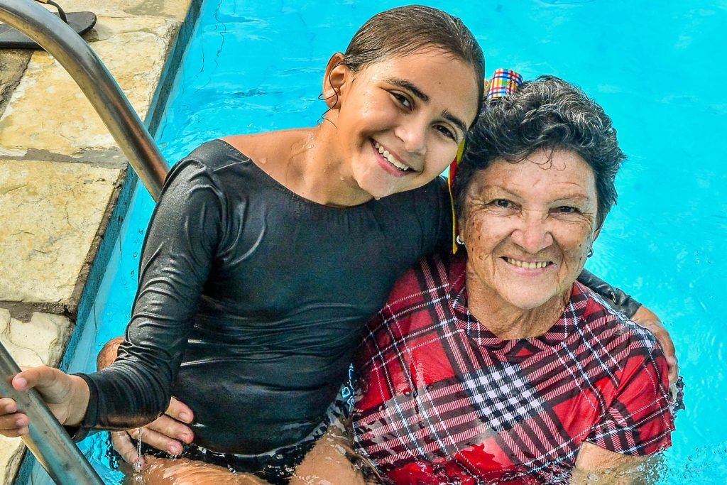 Gorete de Medeiros, de 73 anos, e Sara Heloisa, de 11 anos, não faltam uma aula sequer. Elas são avó e neta e participam da hidroginástica e natação, respectivamente. Gorete sofria de dores no joelho e procurou as aulas por recomendação médica. “Eu comecei a fazer hidro e meu joelho melhorou muito. Eu venho duas vezes por semana, chovendo ou fazendo sol. Hoje mesmo quando saí de casa estava caindo um toró d’água, mas eu vim. Eu não deixo de vir de jeito nenhum. Eu amo demais isso aqui, porque me faz um bem danado. Quando a gente entra de férias, eu sinto falta tanto da aula quanto das amigas”, conta.