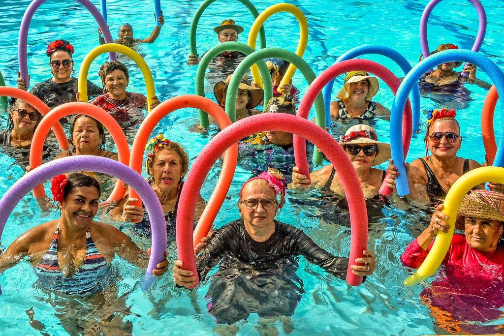 Para a educadora física Rita de Cássia Araújo, a socialização é, também, um importante fator na prática da hidroginástica, principalmente entre idosos. O público-alvo desse grupo é idosos com mais de 60 anos, mas adultos de outras idades com comorbidade são aceitos no projeto. “São pessoas que têm dificuldade de locomoção, têm ou já tiveram problemas articulares. Temos alunos que já colocaram prótese e as aulas de hidroginástica ajudam nessa mobilidade, nessa recuperação. Além de que controla as taxas de glicemia e hipertensão. Isso tudo vai diminuindo”, explica.