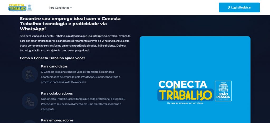 A Prefeitura de João Pessoa, por meio da Secretaria de Desenvolvimento Econômico e Trabalho (Sedest), em parceria com a Federação do Comércio de Bens e Serviços da Paraíba (Fecomércio-PB), lançou a plataforma ‘Conecta Trabalho’ para facilitar o acesso da população ao mercado de trabalho de forma totalmente digital. A ferramenta está em pleno funcionamento e complementa as ações do Sistema Nacional de Emprego em João Pessoa (Sine-JP).