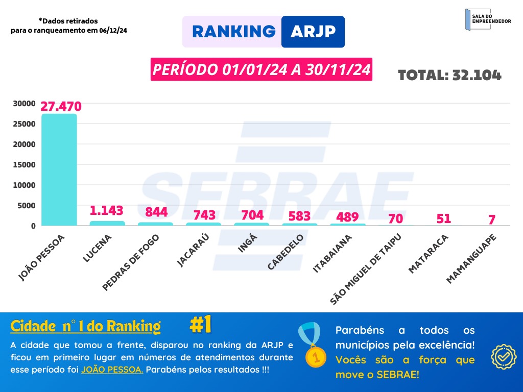 Ranking – Os cinco municípios com maior número de atendimentos da Sala do Empreendedor são: João Pessoa (27.470), Queimadas (21.438), Campina Grande (18.782), Cabaceiras (2.312) e Lagoa Seca (2.080).