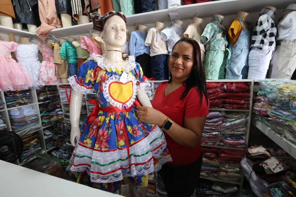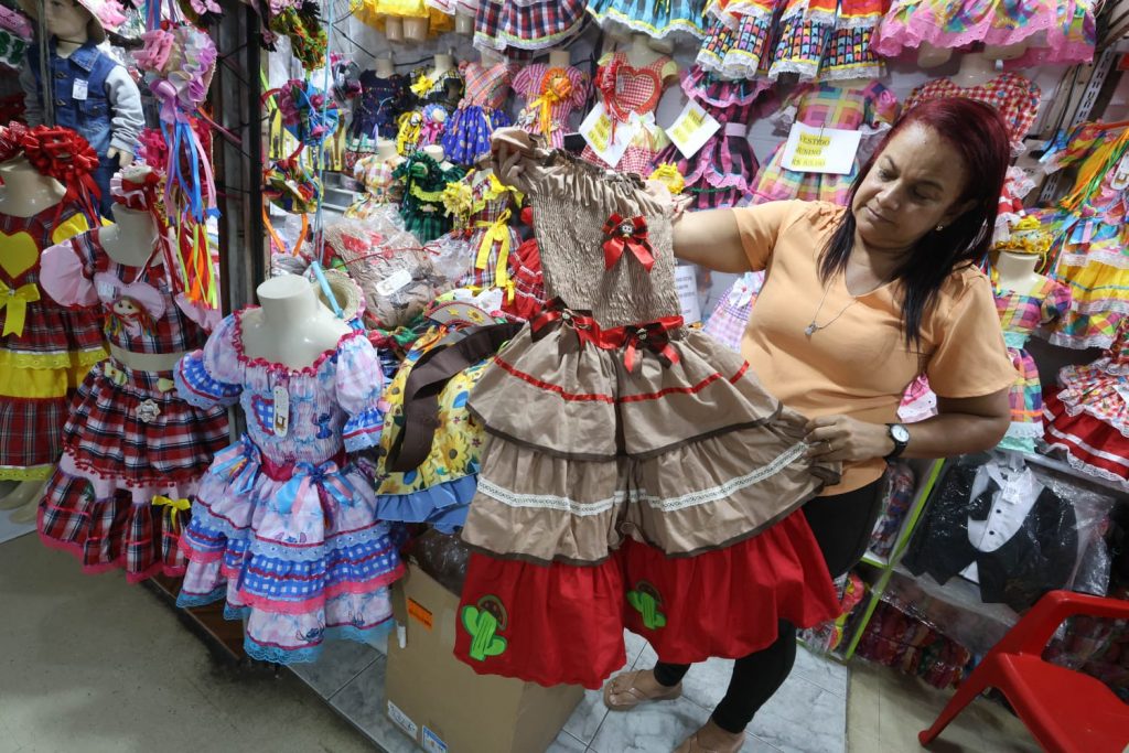 A vendedora Ana Cláudia, que trabalha no Centro Comercial de Passagem, no Parque Solon de Lucena, afirma que neste período junino os produtos mais procurados são roupas, bandeirinhas e balões. A faixa de preços para as roupas varia de acordo com a idade. “De dois a quatro anos, está R$ 130; de seis a oito, custa R$ 150; e no tamanho P adulto, sai por R$ 200”, explica. Porém, todas as peças têm desconto no pagamento à vista – em dinheiro, débito ou Pix. “O cliente que vier para cá a gente garante os 10% ou 20% de desconto”, completou.