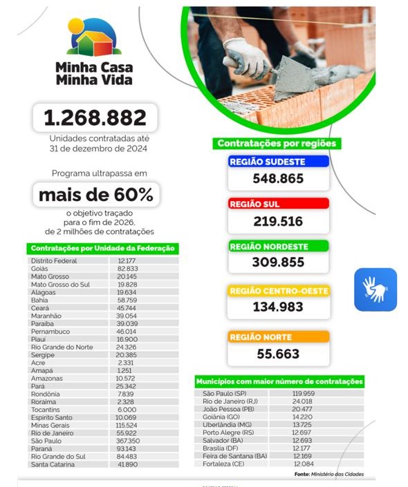 Ainda de acordo com o Governo Federal, o Minha Casa, Minha Vida concluiu 2024 em alta. Já foi ultrapassada em mais de 60% a meta de contratar dois milhões de moradias até o fim de 2026. Levando-se em conta todas as modalidades, o Minha Casa, Minha Vida superou, entre a retomada em 2023 e 31 de dezembro de 2024, 1,26 milhão de residências contratadas.