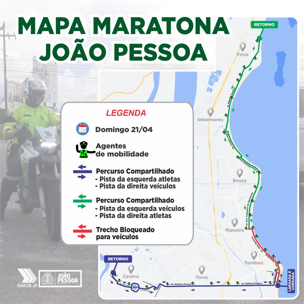 Com o objetivo de garantir a segurança de pedestres e participantes, a fluidez do tráfego de veículos e o ordenamento do trânsito durante a realização da Maratona de João Pessoa, neste domingo (21), a Superintendência Executiva de Mobilidade Urbana (Semob-JP) definiu um plano operacional que será executado, a partir das 4h da manhã, para o balizamento e acompanhamento do percurso da prova.