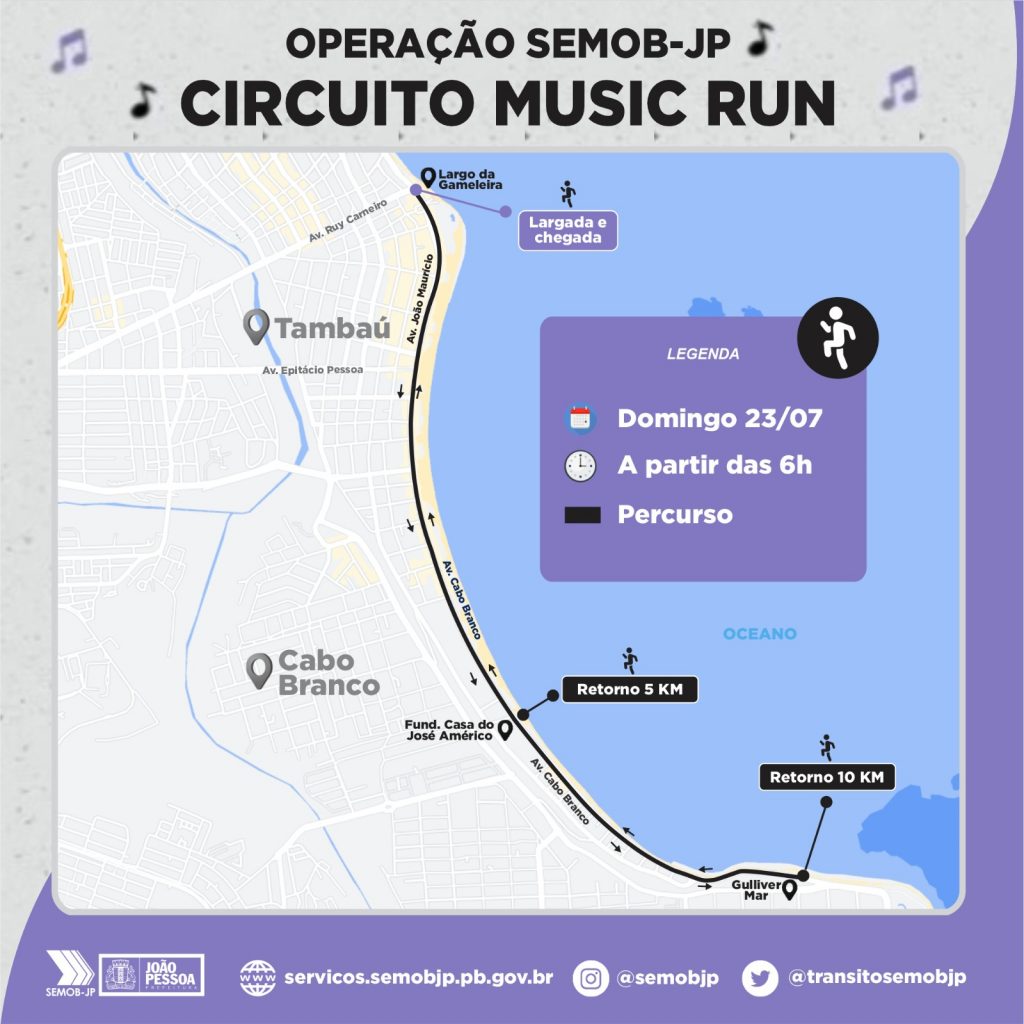 Para garantir a segurança viária durante a realização do Circuito Music Run – Etapa Samba, evento que ocorrerá no próximo domingo (23), na orla de João Pessoa, a Superintendência Executiva de Mobilidade Urbana de João Pessoa (Semob-JP) manterá 25 agentes de mobilidade atuando no entorno da competição, entre as praias de Tambaú e Cabo Branco.
