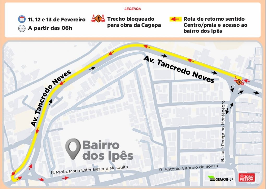 Atendendo solicitação da Companhia de Águas e Esgoto da Paraíba (Cagepa), a Superintendência Executiva de Mobilidade Urbana de João Pessoa (Semob-JP) irá alterar o fluxo de veículos na Avenida Tancredo Neves, a partir das 6h desta terça-feira (11). A interdição temporária consiste no bloqueio do primeiro retorno de acesso a Rua José Peregrino Montenegro (bairro dos Ipês), sentido Retão de Manaíra/Centro. A medida será necessária até a próxima quinta-feira (13).