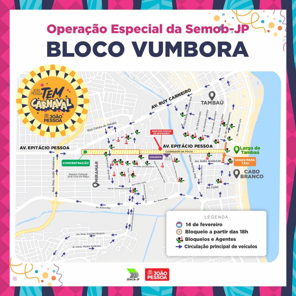 A Superintendência Executiva de Mobilidade Urbana de João Pessoa (Semob-JP) está com todo o seu plano operacional pronto para o desfile do bloco Vumbora, na Via Folia (Avenida Epitácio Pessoa), nesta sexta-feira (14), abrindo a programação do pré-Carnaval da Capital.