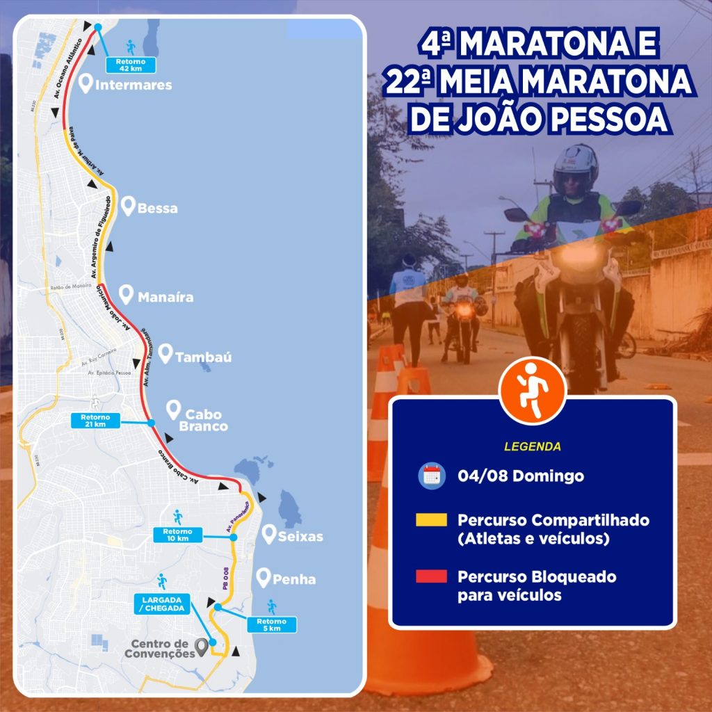 “Com previsão de largada às 4h30 manhã, nossas equipes estarão em campo às 3h da madrugada, sinalizando e monitorando o percurso para garantir a segurança dos eventos, que marcarão os 439 anos de João Pessoa. Dois trechos do percurso, entre a Estação Cabo Branco e o Retão de Manaíra, estarão bloqueados para os veículos. Então, fiquem atentos à sinalização e às orientações dos nossos agentes”, ressaltou o superintendente da Semob-JP, Expedito Leite Filho.